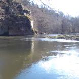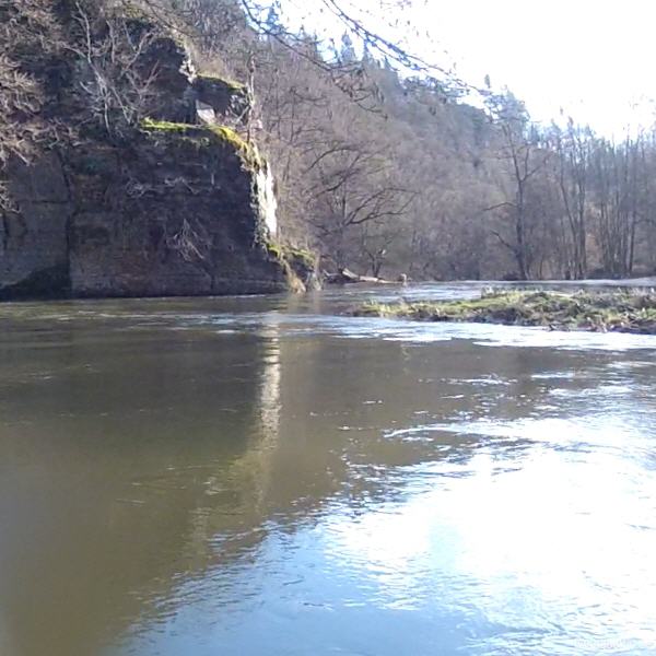 Nun taucht eine Felswand auf, von links fließt ein kleines Bächlein den Hang hinab in die Ahr und das Wasser wird ruhig. Damit kündigt sich ein zurück gebautes Wehr an das gut fahrbar ist. Allerdings ist auch hier Steinkontakt nicht unbedingt unumgänglich.
