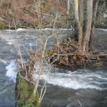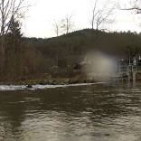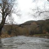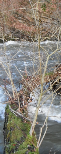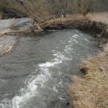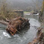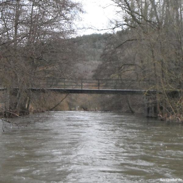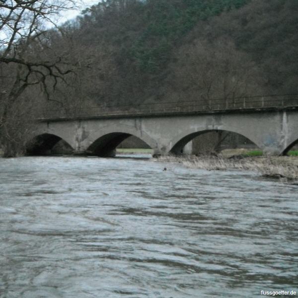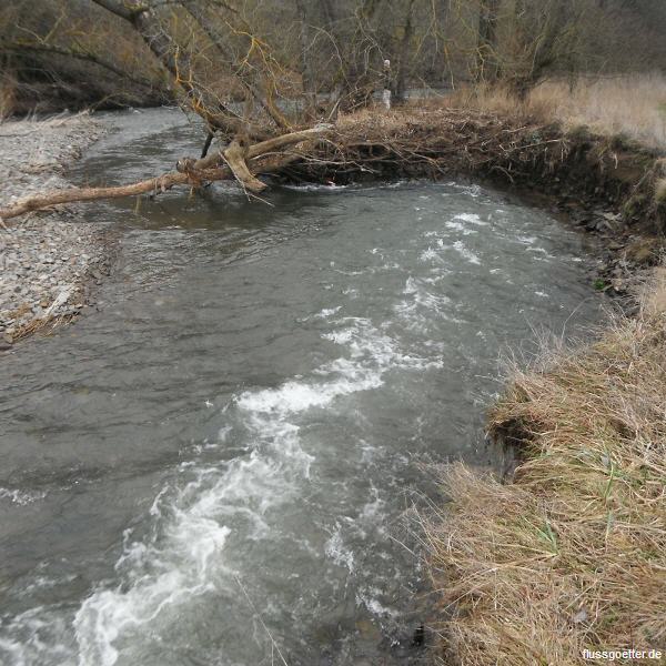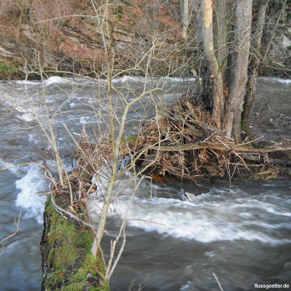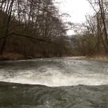 Das folgende Wehr sollte man sich vor der Fahrt ansehen. Hier können Bäume fest hängen und Steinkontakt ist unumgänglich. Generell ist das Wehr jedoch fahrbar. Bei HW gefährlicher Rücklauf.