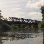 Vorbei an Feldern und Bäumen erreicht man bei km 56,9 eine Eisenbahnbrücke.