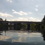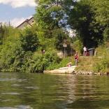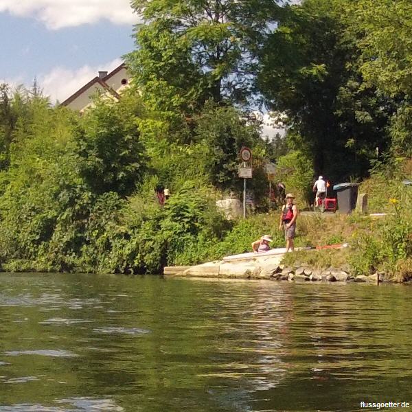 100 m weiter auf der linken Seite befindet sich eine Slipanlage und ein guter Einstieg. Wer hier einsteigt sollte etwas die Lahn aufwärts paddeln, die Insel umfahren und die Schleuse benutzen. Das Wehr (li) an der Insel ist nicht fahrbar.
