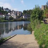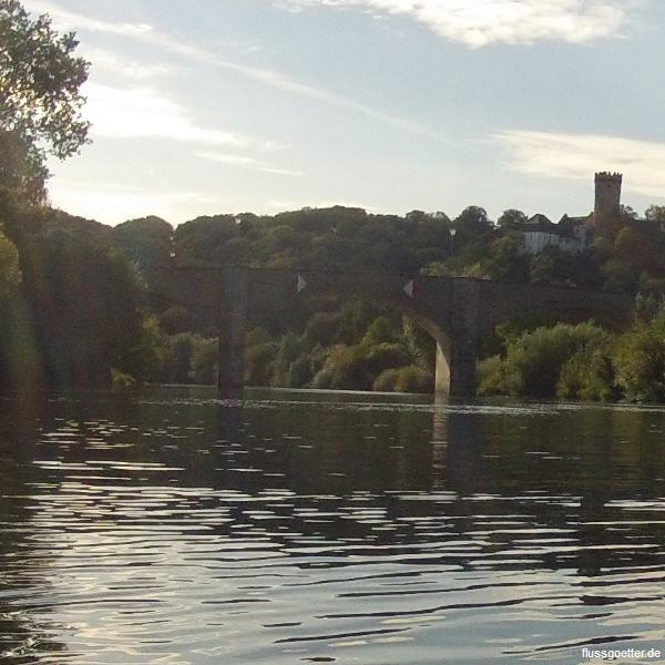 Nach 1,6 km erreicht man eine weitere Einstiegstelle an der nun fast stehenden Lahn. Die Lahn wird an dieser Stelle von der Brückenstraße überspannt und im Hintergrund erhebt sich Burg Dehrn