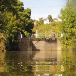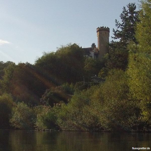 Einfacher ist es, noch 100m weiter flussabwärts, bei km 65,3 die folgende Selbstbedienungsschleuse rechts zu umtragen und die Fahrt hinter der Schleuse zu beginnen. Hinter der Schleuseninsel, strömt von links dass über das Wehr geleitet Wasser hinzu und bildet eine für die Lahn rasche Strömung.