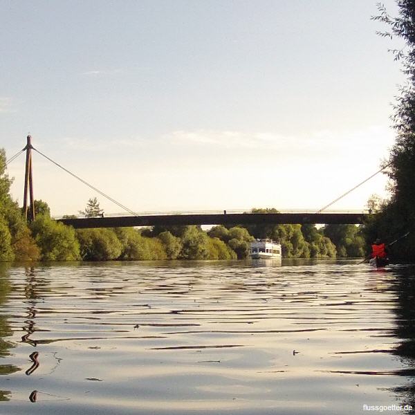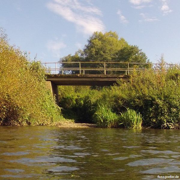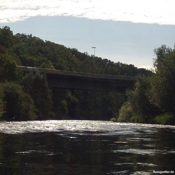 Durch den an dieser Stelle etwas engeren Flusslauf fließt die Lahn etwas rascher unter der Brücke der Steedener Straße hindurch, was jedoch keine Schwierigkeit darstellt sondern vielmehr eine willkommene Abwechslung ist.