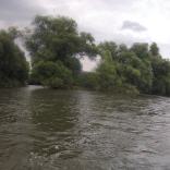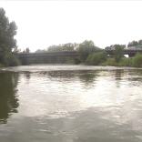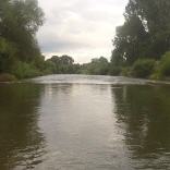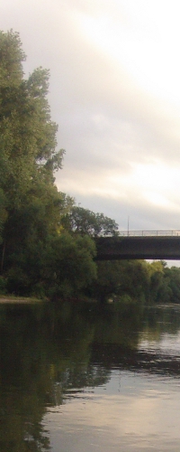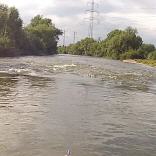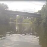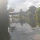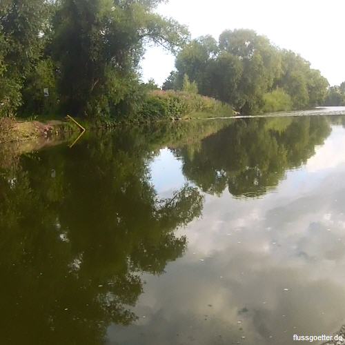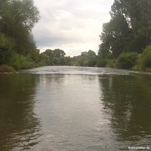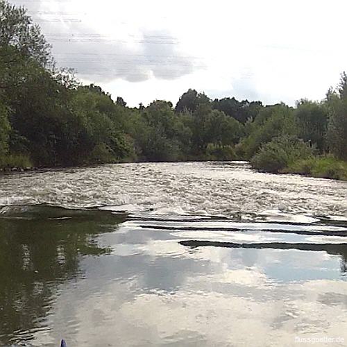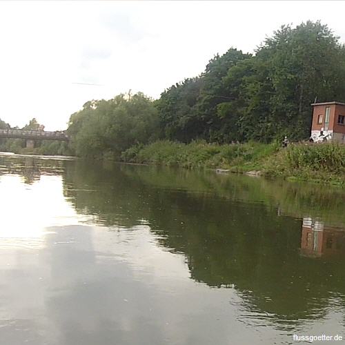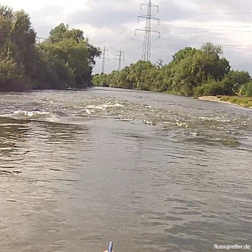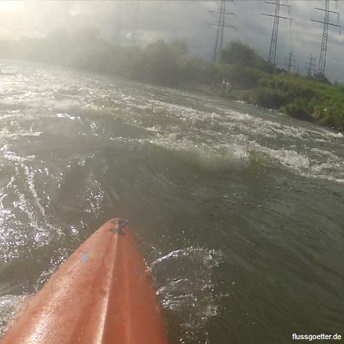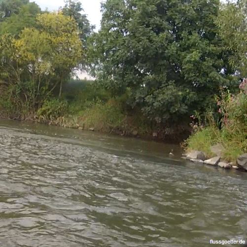 Hat man die Brücke unterquert befindet man sich in einer stark nach rechts zur Uferböschung treibenden Strömung und einem starken Kehrwasserauf der linken Seite was etwas Übung erfordert um es sauber zu fahren.