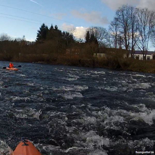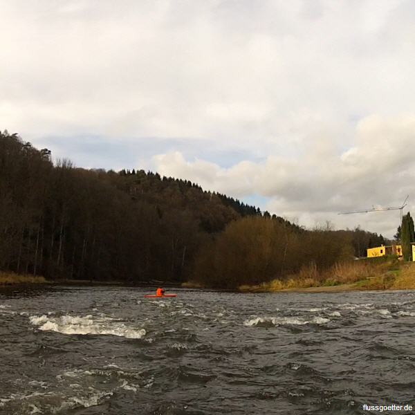 Erreicht man das Wehr, ist auf der linken Seite die 2012 verlegte Bootsrutsche. Früher bildete sich am Ende der Rutsche bei HW ein tödlicher Rücklauf. Ob dies nach wie vor noch so ist, können wir nicht sagen. Daher bei HW lieber ansehen.