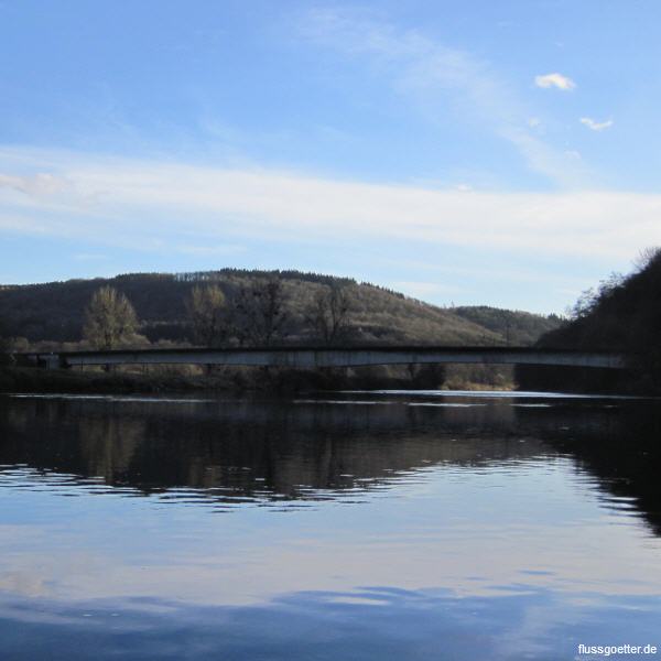 Bei km 58 erreicht man die Straßenbrücke „Zum Hochkreuz“ mit dem Hinweis auf das folgende Wehr mit Bootsrutsche.