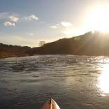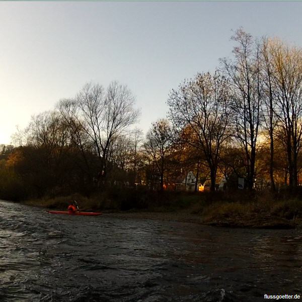 Beim Pegel von 55cm steckt man nun erstmal auf Grund fest. Sobald man wieder etwas Wasser unterm Boot hat passiert man ca. 200m weiter wieder einen Schwall.